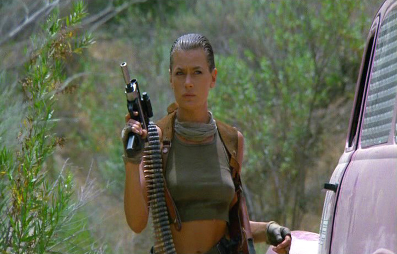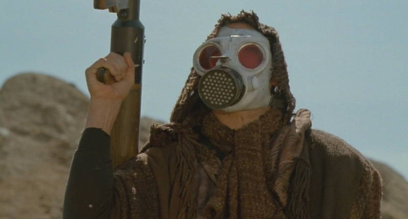 But don’t worry. None of that overwhelms what essentially boils down to Sandahl Bergman doing a sexy dance before joining Rowdy Roddy Piper in beating up and shooting a bunch of frog men. So there’s your political subtext tossed out the window before we get to the hot and heavy film-reference pastiche climax of the film, where we get loaded references to Mad Max 2: The Road Warrior (1981), Big Trouble in Little China (1986), Raiders of the Lost Ark (1981), and the final battle takes place at Vasquez Rocks, where Kirk fought Gorn in the classic Star Trek episode “Arena.”